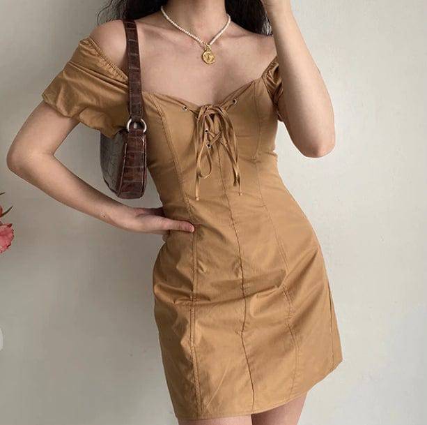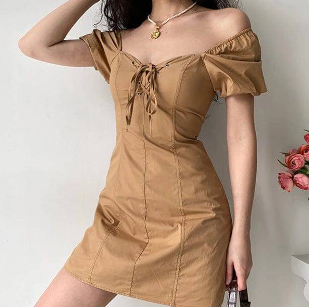 Puffy Sleeves Brown Mini Dress