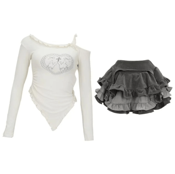 Get ready to rock this Kawaii Off Shoulder Outfit Set! With its trendy off-shoulder white top and cute skirt, you'll be the talk of the town. Perfect for a fun day out or a night on the town, this set will have you looking and feeling your best. So don't wait, add it to your wardrobe today!