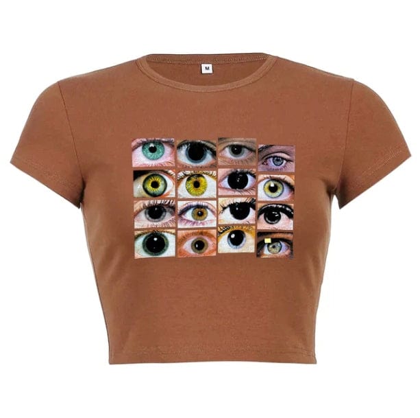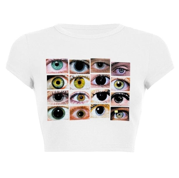 Description: This aesthetic Weirdcore Crop Top is just what you need to complete your outfit for this season. Unique design featuring selection of different eyes is sure to grab lots of attention anywhere you go . Very soft and comfortable. A must have for every aesthetic girl.