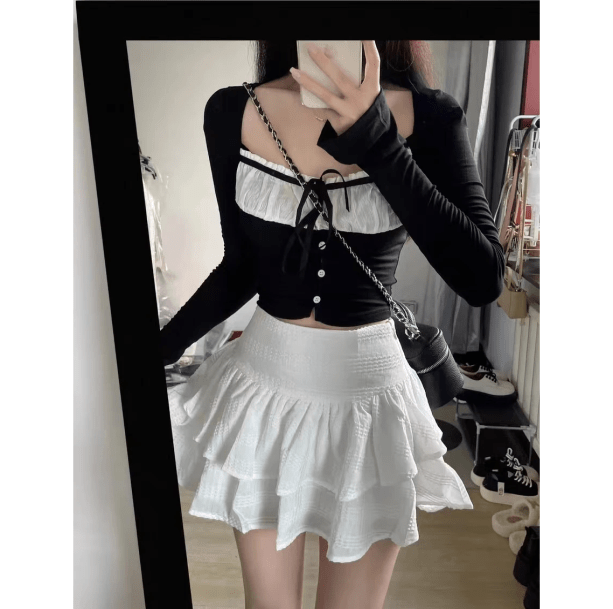 Introducing the Y2K Aesthetic Outfit Set, your go-to for quirky vintage vibes. This 2-piece set includes a plaid crop top with a playful square collar and lace-up details, paired with a flowy white A-line skirt. Perfect for channeling your inner Y2K fashionista!